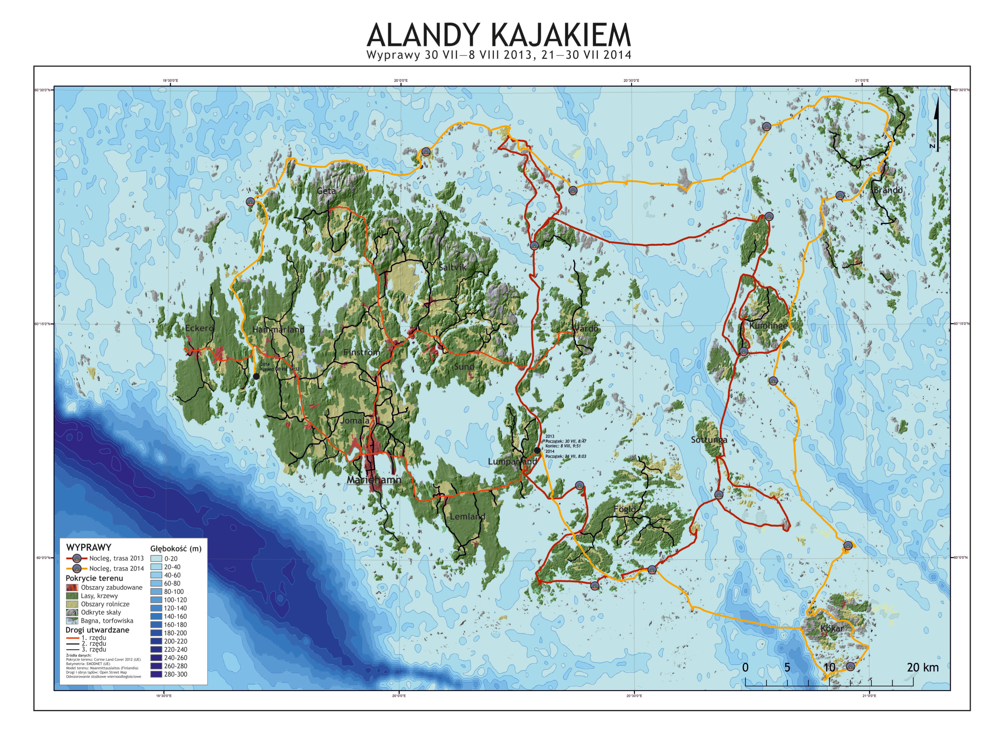 One of my first larger map projects documenting two kayak expeditions in the Aland Islands, one of which I took part in. If I were to make this map again now I would probably make some changes, but I'm putting it here for completness sake.
