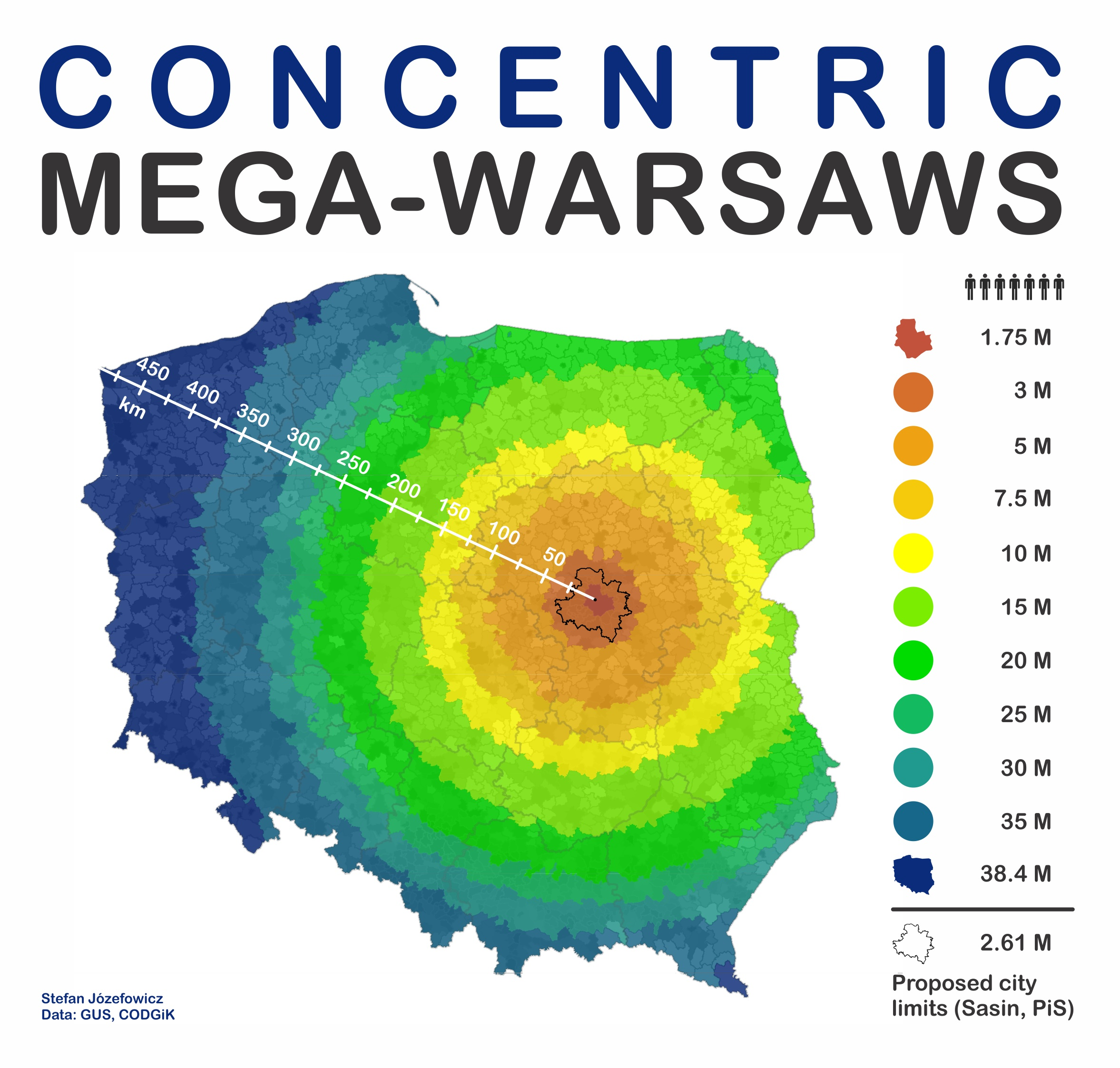 A tongue in cheek map I put together showing my hometown, absurdly oversized. The map concept is visibly silly, however there at the time of my making this map there was a new proposal being discussed that would significantly alter Warsaw’s boundaries and governance. I used publicly available data (demographic data from GUS - the Polish Census Bureau, and spatial data from CODGiK).